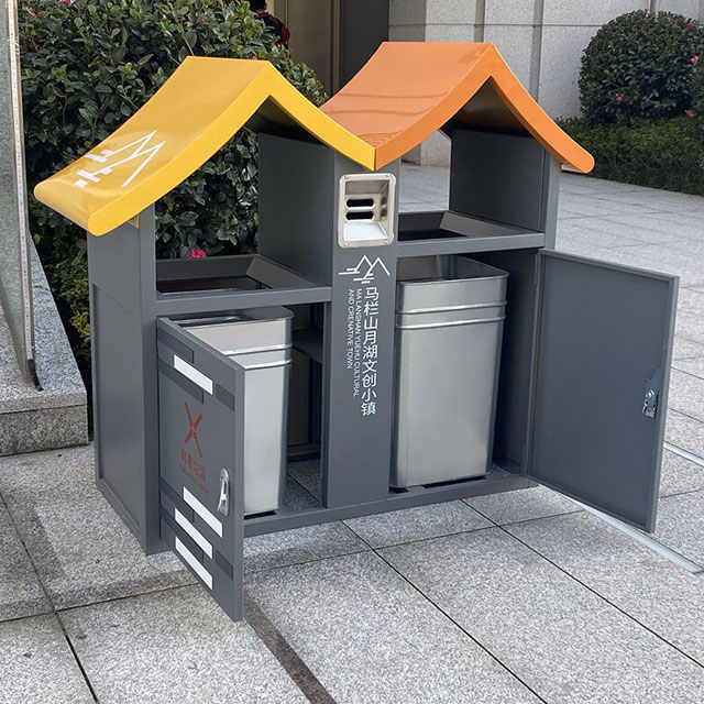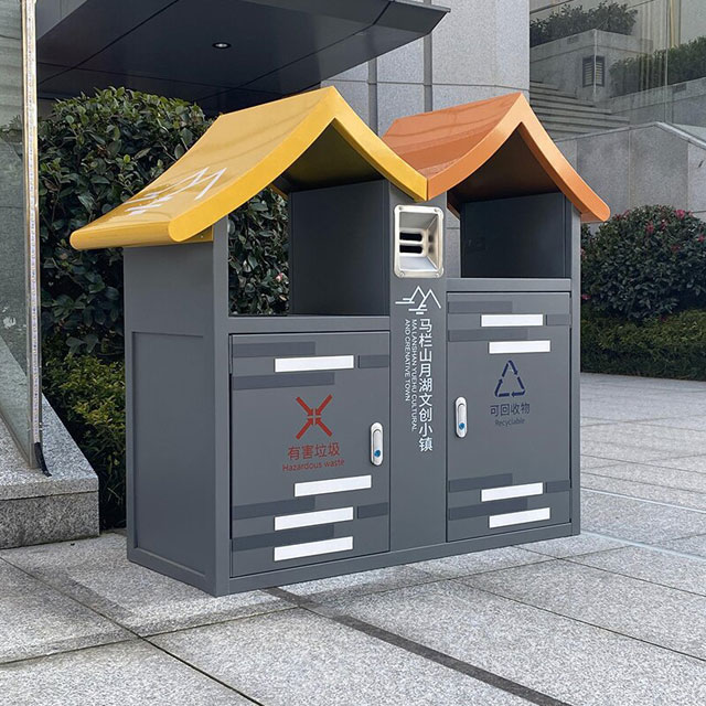 其廣泛的適用性使其成為各類戶外場所的理想選擇。在公園中,它可以放置在各個景點和休息區域,引導游客進行垃圾分類,保護公園的自然環境;在住宅小區,它能擺放在每棟樓的入口處,方便居民分類投放垃圾,提升小區的整體環境品質;在學校校園內,能培養學生的環保意識,讓垃圾分類從小抓起。總之,這款戶外屋形鍍鋅板分類垃圾桶,憑借其獨特的設計和實用的功能,能夠在各種戶外場景中發揮重要作用,助力環保行動的深入開展。