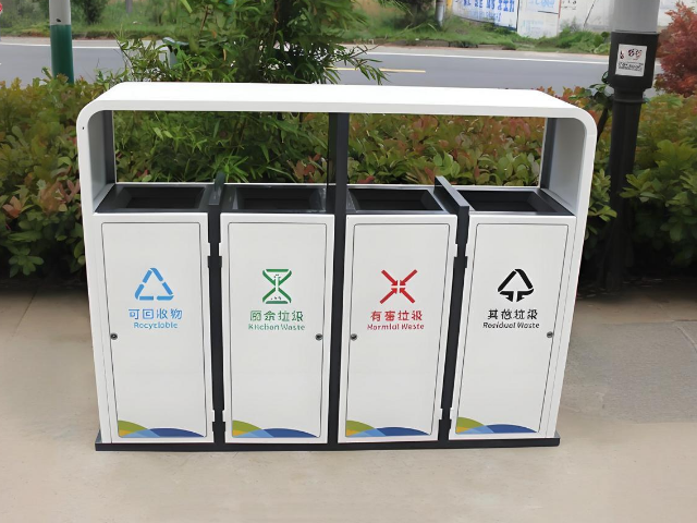傳統單桶垃圾容器已無法滿足精細化分類需求,四連體結構通過物理分隔實現四分類精準投放,將可回收物、有害垃圾、廚余垃圾和其他垃圾的收集系統整合于同一空間單元。金屬材質選用1.2mm厚鍍鋅鋼板,經磷化處理和靜電噴塑工藝,使產品具備IP65防護等級,可耐受-30℃至80℃極端氣候。四色分區設計配合高清絲印標識,使分類指引可視距離達15米以上,有效降低誤投率。