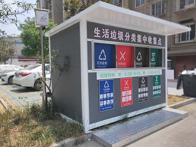 目前,戶外生活垃圾分類集中收集房是城市生活垃圾處置的主流趨勢,也是現代城市文明進步的標志之一,有利于提升垃圾清運效率,便于再生資源的回收利用,減少環境污染,緩解環衛工人常規保潔的壓力。垃圾分類亭,分為地基基礎設施、公益宣傳欄、立柱、頂棚等,亭內設置可回收、有害垃圾、廚房垃圾和其他垃圾等垃圾桶,垃圾桶及宣傳欄配有垃圾分類的宣傳標語,廣大群眾可以根據垃圾桶的提示標語,將廢棄的生活垃圾投放到對應的垃圾桶中。