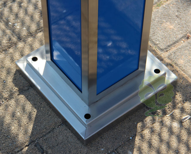 C635戶外吸煙柱規格250*250*1180mm,呈長條傳,側面有三角鑰匙,可以打開側門,方便清理位于內套管的煙蒂煙灰,底座分兩種,一種是室內采用的,在底部裝有防滑墊,一種是戶外采用的,底部使用膨脹螺絲固定。