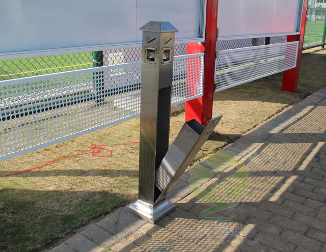 C633-1廠家定制滅煙柱采用優(yōu)質(zhì)不銹鋼剪切、組裝、焊接、絲印而成,它包括外套管、支座、內(nèi)套管、煙灰盒、底座。外套管的底端固定連接在支座上,外套管的側(cè)壁上設(shè)有煙蒂置入口,內(nèi)套管用于集中收納從外套管的煙蒂置入口投入的煙蒂,內(nèi)套管設(shè)在外套管的內(nèi)管腔中,內(nèi)內(nèi)套管的開口端朝上,煙蒂置入口與內(nèi)套管的開口相連通,以使得從煙蒂置入口投入的煙蒂可從內(nèi)套管的開口端落入到內(nèi)套管的內(nèi)管腔中;