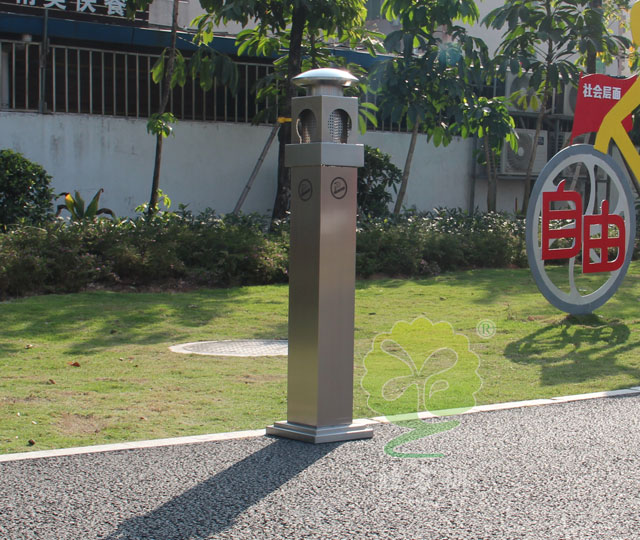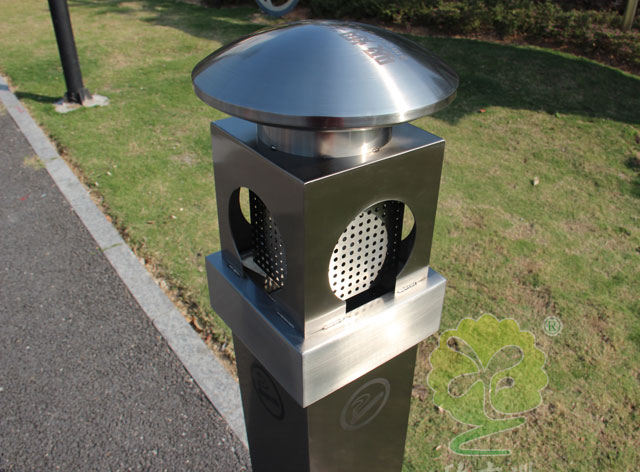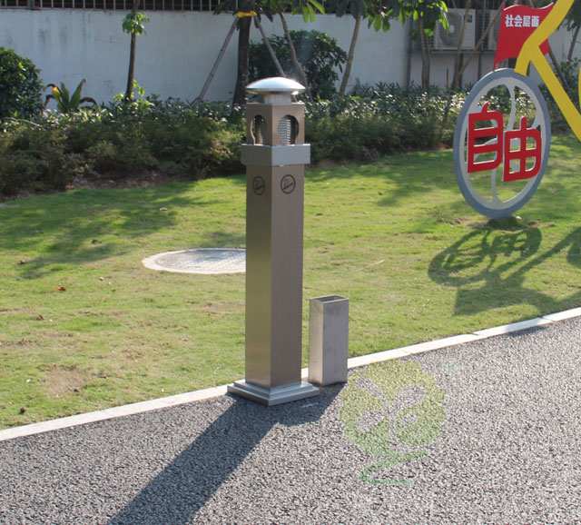 C618室外街道滅煙柱采用優(yōu)質(zhì)不銹鋼剪切、組裝、焊接、絲印而成,它包括外套管、支座、內(nèi)套管、煙灰盒、底座。外套管的底端固定連接在支座上,外套管的側(cè)壁上設(shè)有煙蒂置入口,內(nèi)套管用于集中收納從外套管的煙蒂置入口投入的煙蒂,內(nèi)套管設(shè)在外套管的內(nèi)管腔中,內(nèi)內(nèi)套管的開口端朝上,煙蒂置入口與內(nèi)套管的開口相連通,以使得從煙蒂置入口投入的煙蒂可從內(nèi)套管的開口端落入到內(nèi)套管的內(nèi)管腔中;