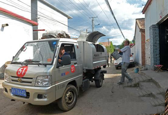 9月1日,在承德市雙橋區(qū)雙峰寺鎮(zhèn)村,垃圾清運車在清運村里的生活垃圾。