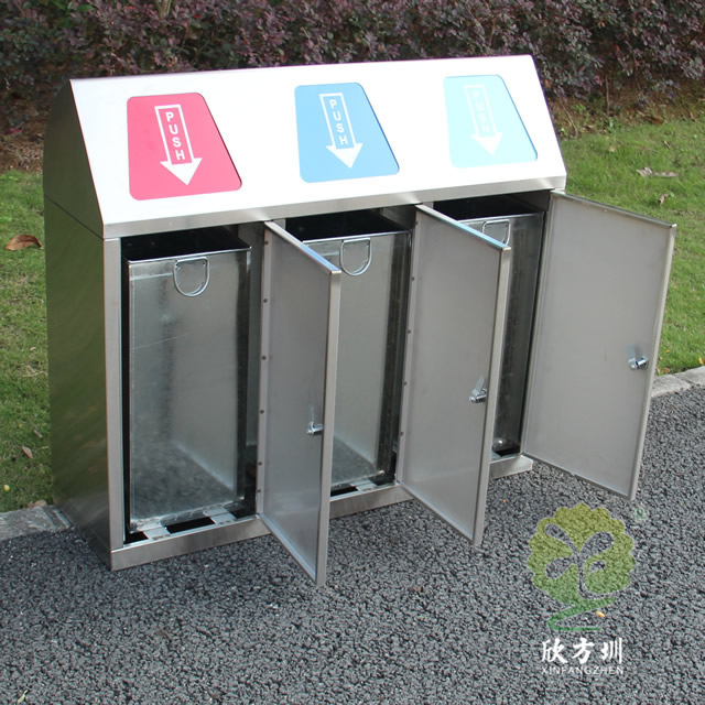 戶外學校帶蓋三分類不銹鋼垃圾桶采用201#,202#,304#優(yōu)質(zhì)不銹鋼材料模壓成型,堅固耐用,不易破損;耐火安全,抗高低溫,適合各種惡劣氣候條件;金屬亮澤,高雅美觀,廣泛適用于各種機場、商場高檔場所;內(nèi)外表面光潔,減少垃圾殘留,易于清潔;配置鍍鋅板內(nèi)桶,便于垃圾清倒;激光切割開料,尺寸精準,投口無縫焊接成型,打磨拋光處理圓滑不割手,欣方圳不銹鋼分類垃圾桶制作師傅有著多年經(jīng)驗的熟手,每一道環(huán)節(jié)工藝成熟,質(zhì)量可靠,確保客戶如期交付驗收。