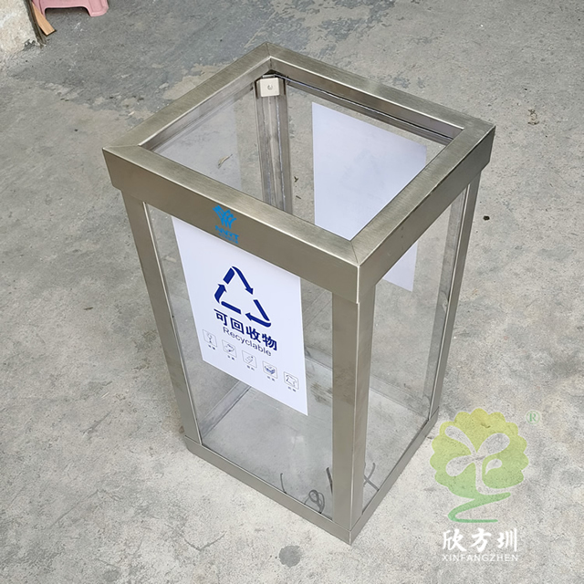 地鐵站透明防爆不銹鋼分類垃圾桶框架可以采用201或者304不銹鋼板制作,方形設計可透視看見里面的廢物,透明板材采用了亞克力板,這款垃圾桶不是真的防爆而是可以看到里面有沒有危險物品,一般都是套透明的塑料袋使用,正反面貼了一個可回收物的分類標識,里面帶螺絲帽擰開方便更換亞克力板,我們欣方圳制作過很多這種透明防爆桶基本上都是用于人群密集的地方,可以根據客戶要求定制。