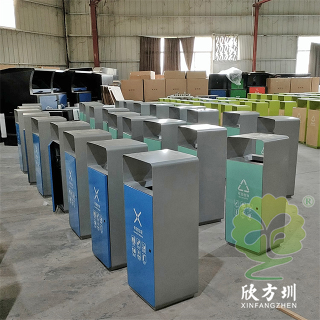 室外加厚組合三色不銹鋼分類果皮箱使用了201#不銹鋼板制作,外部框架采用了2.5mm厚,桶身采用了1.0mm厚的不銹鋼板裁剪折彎制造,單筒雙面側面投口方形設計,可以任意自由組合分類,外部框架噴塑灰色,門板正反面噴塑了不同的顏色,可回收物噴塑淡藍色、有害垃圾噴塑天藍色、其他垃圾噴塑了淡灰色,可以組合制作兩分類、四分類、五分類。