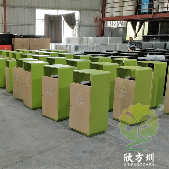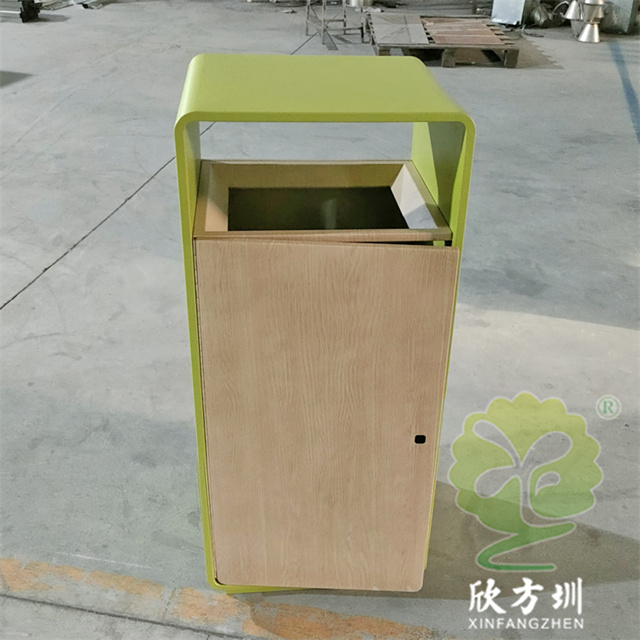 室內戶外轉木紋方形不銹鋼垃圾桶采用了304不銹鋼板制造而成,方形雙面投口單筒設計,桶身框架采用了淡綠色噴涂噴塑上色,框架板材雙層折彎更佳耐用,桶身雙面門板采用了轉木紋工藝制作,內筒可以使用三角鑰匙打開門板取出內置的內筒,正反面絲網印刷了白色的其他垃圾最新國標,可以定制雙分類或者多分類的桶。