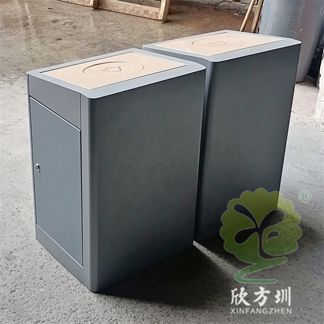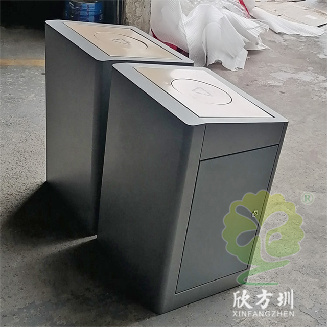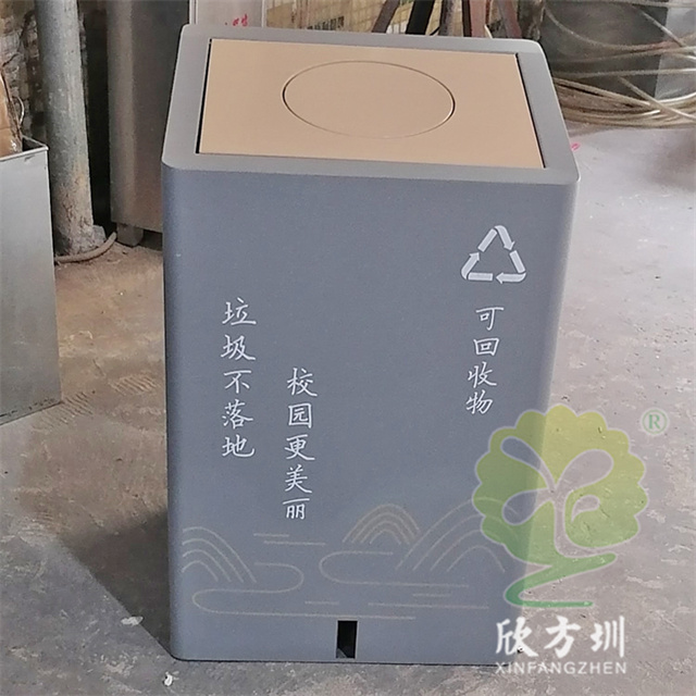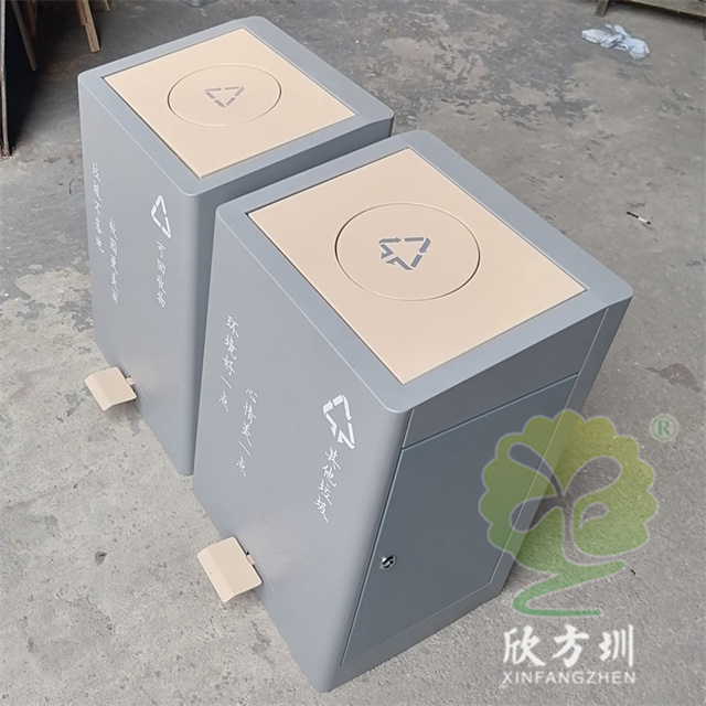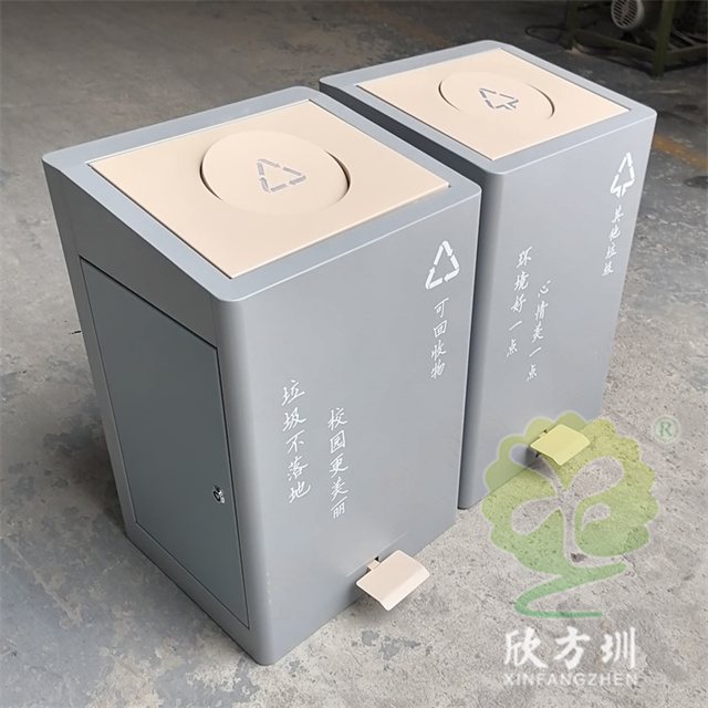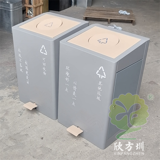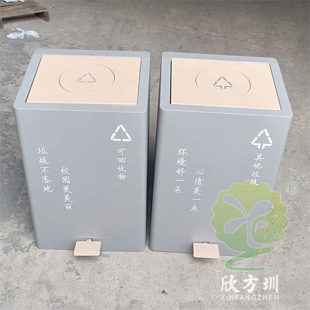 室內(nèi)校園腳踏式不銹鋼分類垃圾桶外桶整體優(yōu)質(zhì)201不銹鋼生產(chǎn),厚度1.0mm厚度(足0.92mm),方形組合式帶腳踏蓋子加搖蓋雙開蓋設(shè)計,顏色按照甲方要求顏色噴塑,外桶表面整體噴塑淺灰色,使用了白色油墨絲印了可回收物和其他垃圾分類標(biāo)識和文字。