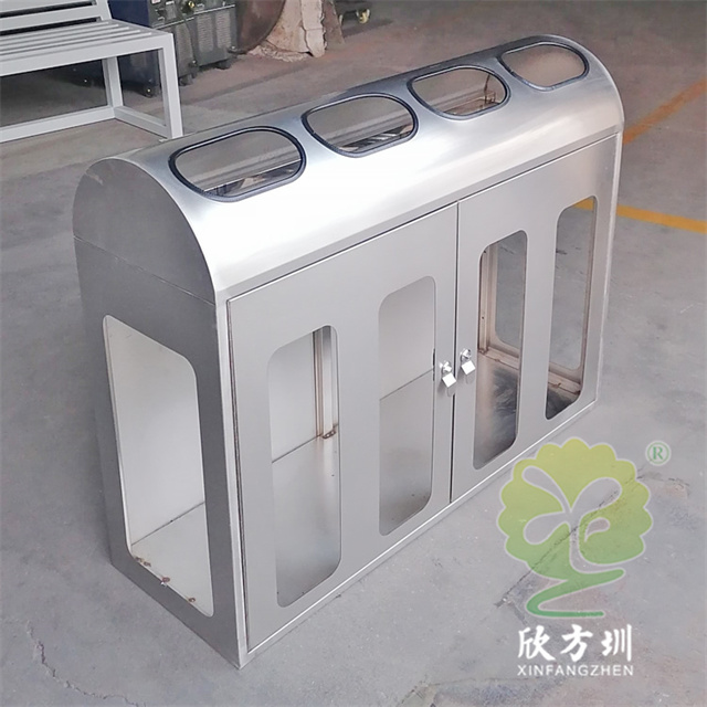 陜西透明防爆不銹鋼分類垃圾桶外筒201不銹鋼,1.2mm厚度(足1.12mm)用戶定制了兩種規(guī)格兩分類和四分類的,這款果皮箱不含內(nèi)筒,桶身正面開(kāi)門(mén),正面和兩個(gè)側(cè)面有透明亞克力板4mm厚度(足3.75mm),桶身正面絲印分類標(biāo)識(shí)和西安地鐵的LOGO,投口粘黑色膠條有效防止割到手,可以打木架或者紙箱包裝,帶導(dǎo)軌和彈簧。