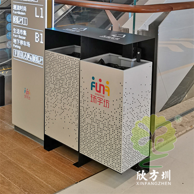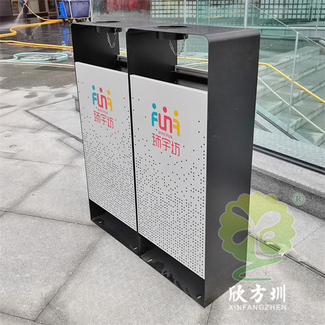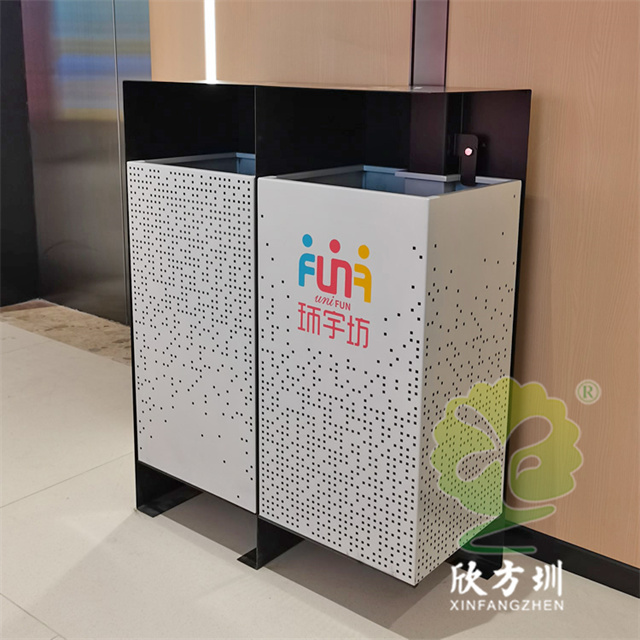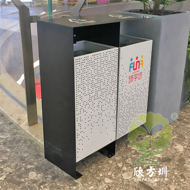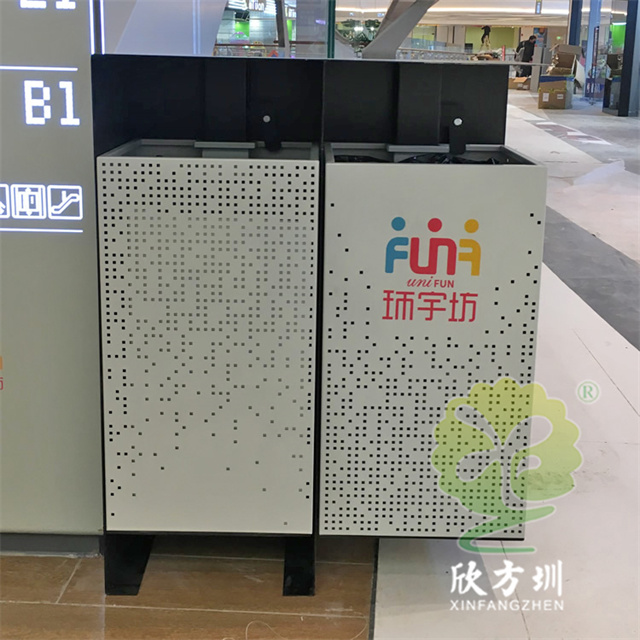 四川商場鏤空加厚不銹鋼分類垃圾桶可以選擇用鍍鋅板、冷軋鋼板或者不銹鋼板制造,這款垃圾桶框架比較厚實能夠防止割到手,表面噴涂噴塑俗稱噴粉,外部框架噴塑黑色箱體噴塑淺灰色,箱體圓點鏤空,這款垃圾桶是一家商場定制了兩款,一款用于商場室內一款用于戶外的廣場,桶身正反面絲印的企業的分類標識。
