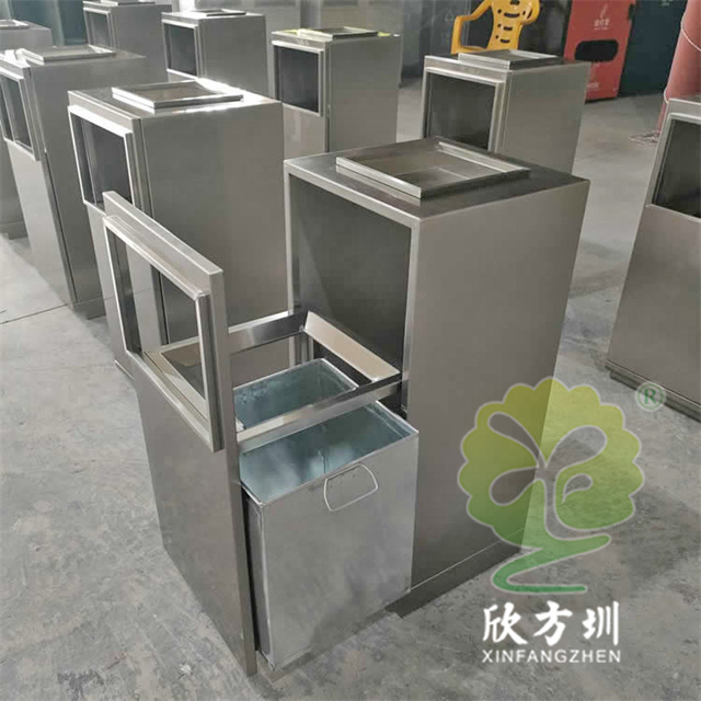 防指紋封油抽拉組合式不銹鋼分類垃圾桶可以使用201或304不銹鋼板制造,方形滑軌抽拉式組合式設(shè)計(jì),表面做了無指紋封油處理,投口方形折邊有效防止割手,頂部位置帶煙灰盅,不需要也可以不要煙灰盅,正面可以絲印分類標(biāo)識(shí)以及企業(yè)logo。