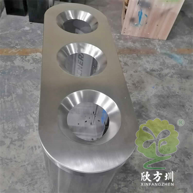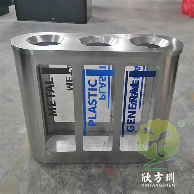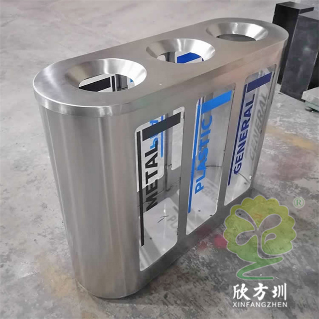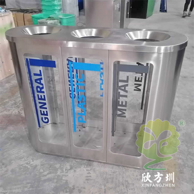 室內地鐵站商用透明不銹鋼分類垃圾桶可以選用201或者304不銹鋼板制作,立式橢圓形連體三分類設計,透明查探區域可以采用高清的亞克力板或者鋼化玻璃制造,透明板可以絲印中英文文字或者做貼紙,投口圓錐形平滑投遞廢物不易傷手,表面可以噴粉和電鍍支持定制。