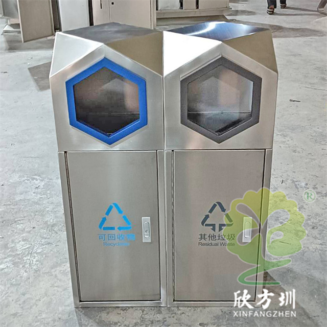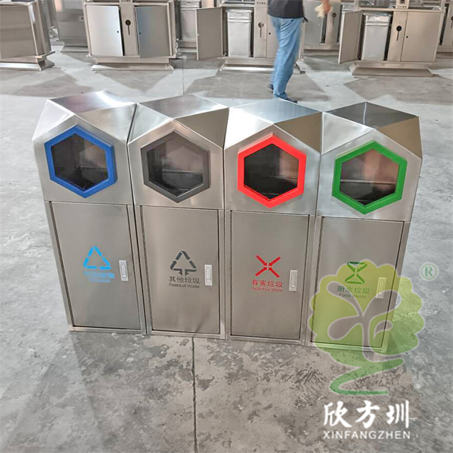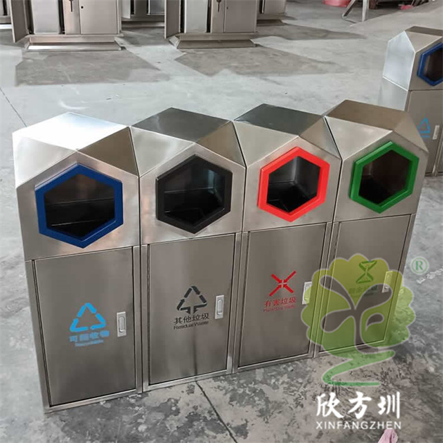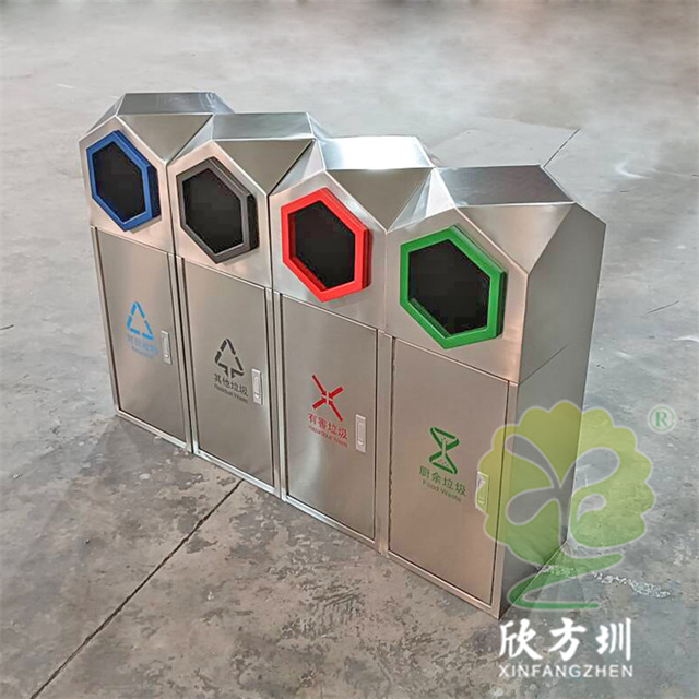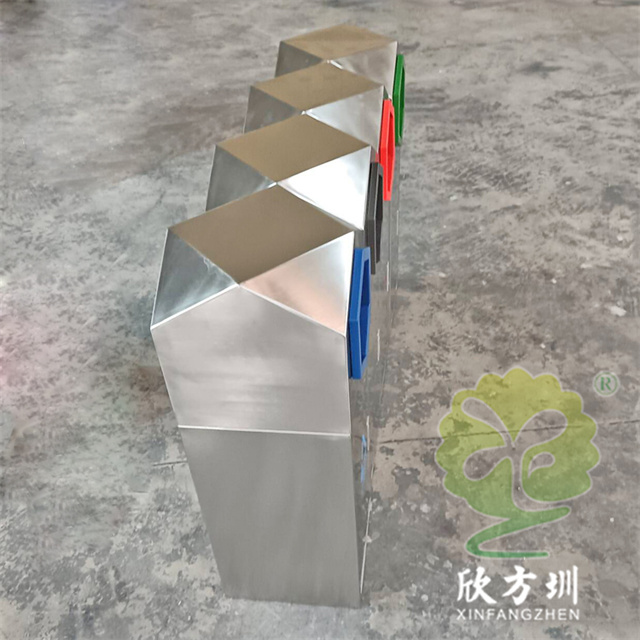 戶外公園組合式菱形不銹鋼分類垃圾桶可以采用201或者304不銹鋼板制作,單筒組合式頂部菱形設計,六邊形投口不銹鋼烤漆四色噴塑,無煙灰盅門板磁吸方便取出內筒,此款果皮箱可以定制鍍鋅板烤漆,門板可絲網印刷中英文國標分類標識,支持做腐刻、電鍍、拉絲、防指紋處理等工藝。