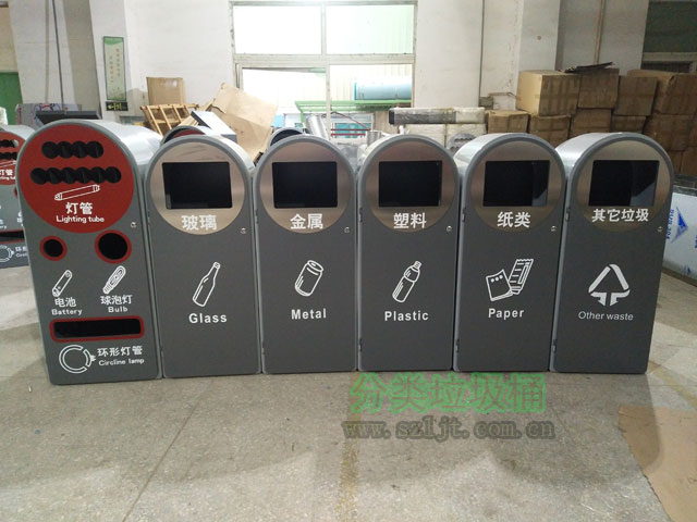 玻金塑紙垃圾分類垃圾桶分為兩種型號xfz-f327:1018*496*1178mm,xfz-f328:496*456*1116。其采用優質冷軋鋼材料經動床沖孔、防銹、防腐處理后表面烤漆處理,耐火安全,抗高低溫,適合各種戶外惡劣氣候條件,堅固耐用,不易破損,廣泛應用于工業園區,市政街道、物業小區、景區公園等場所。其外觀造型經典時尚,功能設計十分成熟,做工精致,色澤艷麗。在美化城市環境的同時,也成為城市優美,獨特的風景線。玻金塑紙垃圾分類垃圾桶采用連體式設計,底座可固定在地上,抗打擊,坑風力。箱體體積大,便于垃圾收納,徹底解決垃圾過多,垃圾溢出的問題。箱體分為5類,分別是玻璃、金屬、塑料、廢紙和有害垃圾,能大致覆蓋居民日常生活中可回收垃圾的種類,可以大大提高垃圾的分類效率,提高自然資源重復利用率,節約資源,保護環境。