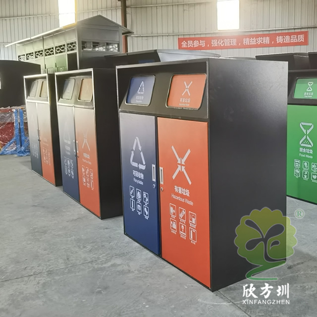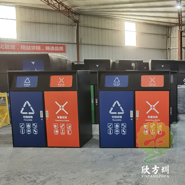 戶外組合帶蓋鍍鋅板分類垃圾桶外桶采用了鍍鋅板制作而成,兩連體組合分類方形搖擺蓋設計,外桶表面黑色噴涂噴塑,這款垃圾桶用戶是兩套組合成了四分類,門板和蓋子噴塑了不相同的顏色,廚余垃圾噴塑了綠色,其他垃圾噴塑了黑色,可回收物噴塑了藍色,有害垃圾噴塑了紅色,門板上絲印了最新國標分類標識,可以使用三角鑰匙開門取出內筒。
