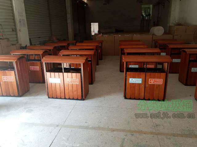 【產(chǎn)品顏色】:以山樟木的原色黃色為主色,覆蓋于桶身;垃圾桶的邊緣的鋼板立柱使用黑色絲?。煌吧斫z印紅綠兩色標牌,分別代表不可回收垃圾與可回收垃圾,顏色對比鮮明和諧,簡潔大方,實用美觀,還可根據(jù)客戶需求定制。