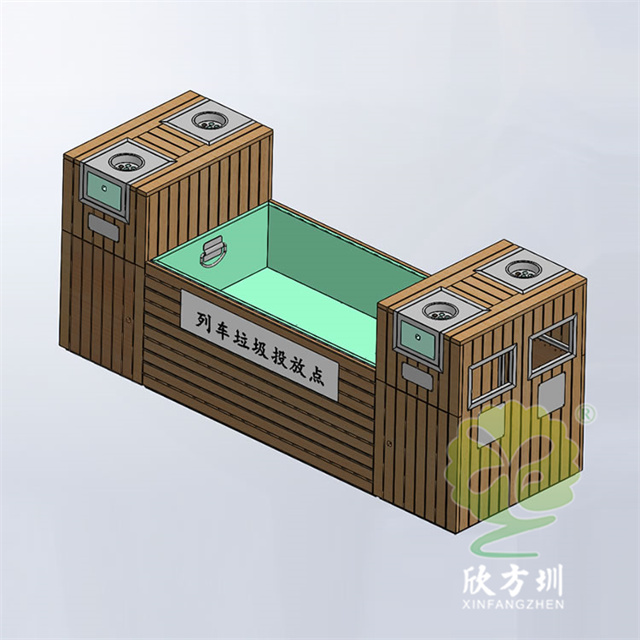 高鐵站連體組合鋼木分類垃圾桶是青海一位顧客在我們工廠定制的,這款垃圾桶設計比較特殊是兩個兩連體的垃圾桶加一個方形的列車垃圾投放處組合擺放,采用了防腐木加不銹鋼及冷軋鋼板制作而成,用戶定制了兩張不同顏色的防腐木條,中間這個投放處方便列車員扔廢物,旁邊兩個垃圾桶方便旅客扔垃圾及抽煙使用,頂部配備了4個滅煙盒。